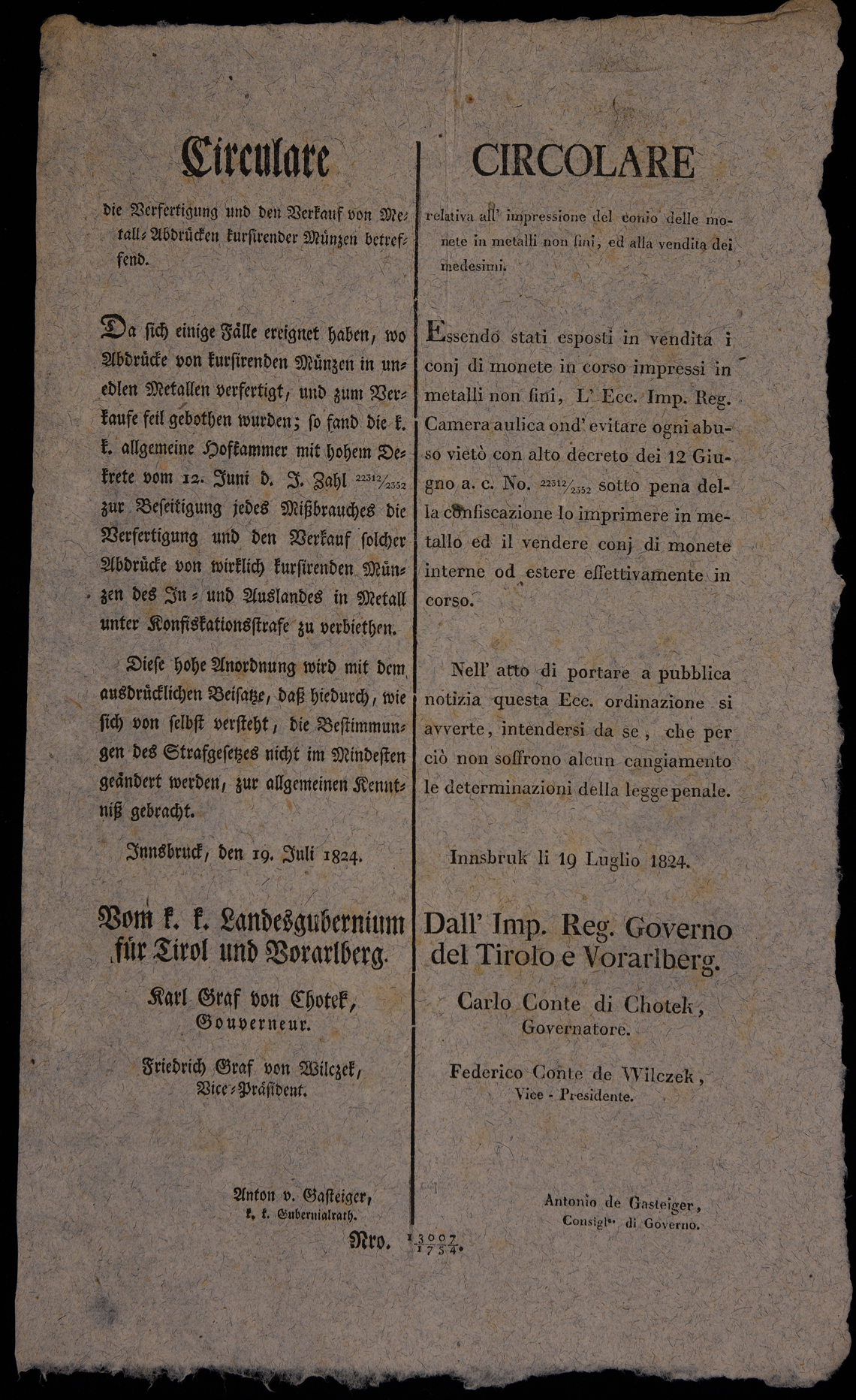 Proclama del Governo di Tirolo e Vorarlberg sul conio delle monete, emanato il 19 luglio 1824, sottoscritto da Karl Chotek, Friedrich Wilczek, Joseph von Thaler