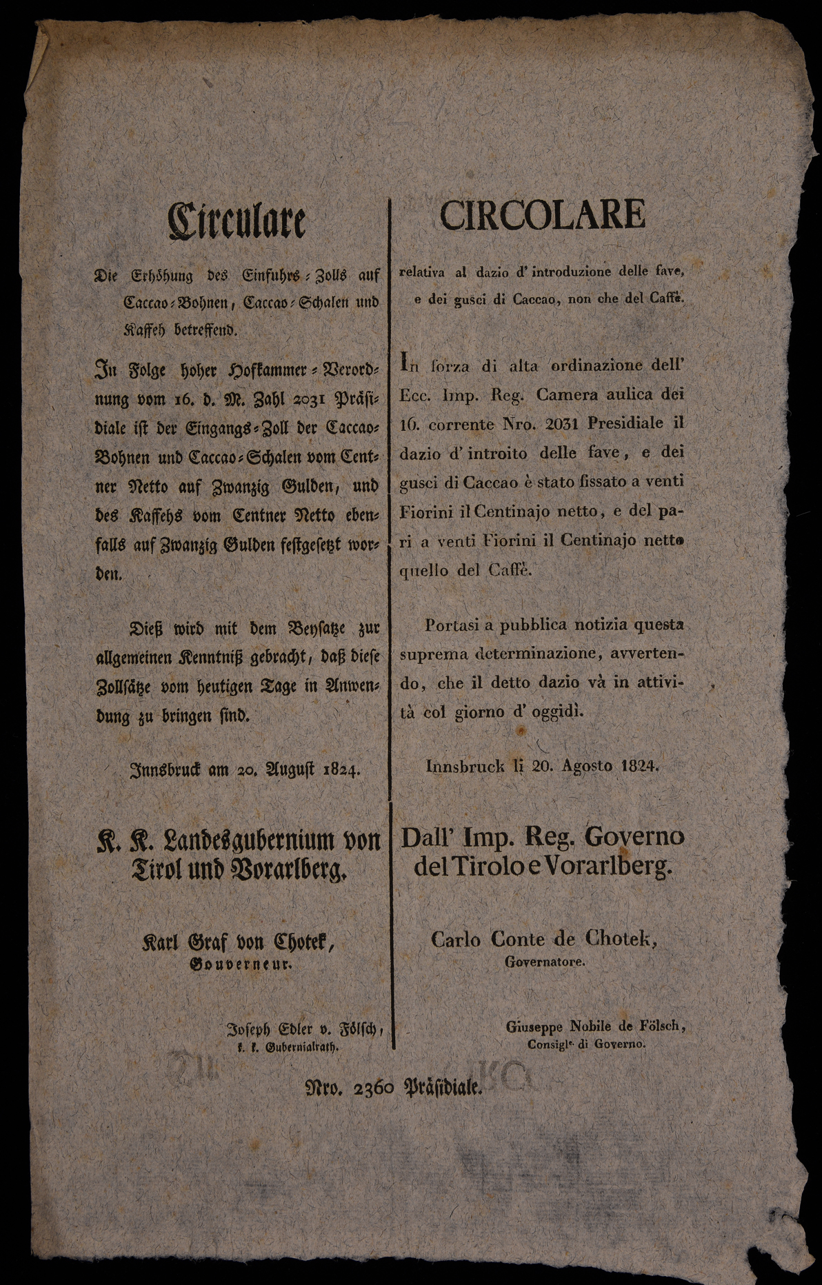 Proclama del Governo del Tirolo e Vorarlberg sui dazi delle fave di cacao e caffè, emanato il 20 agosto 1824, sottoscritto da Karl Chotek e Joseph Fölsch