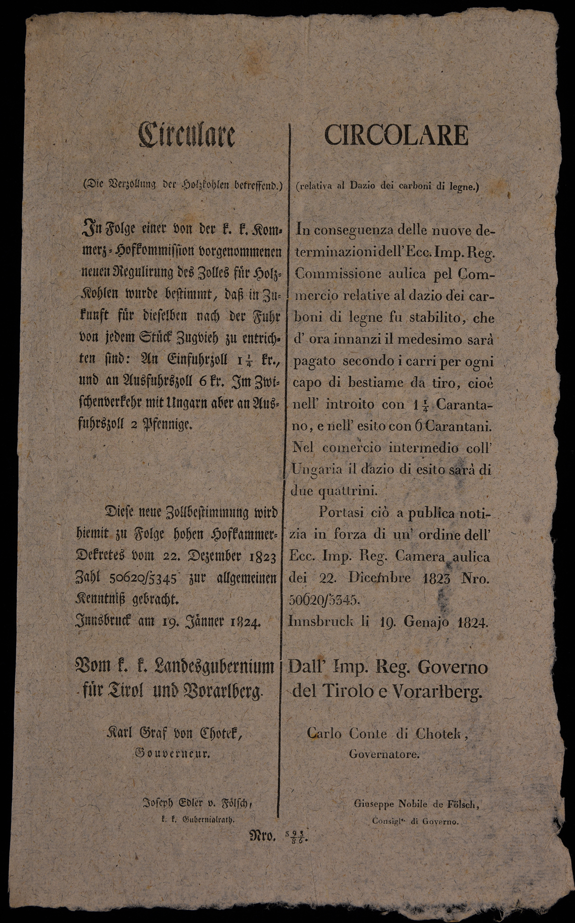 Proclama del Governo del Tirolo e Vorarlberg sulle tasse relative al carbone di legna, emanato il 19 gennaio 1824, sottoscritto da Karl Chotek e Joseph Fölsch