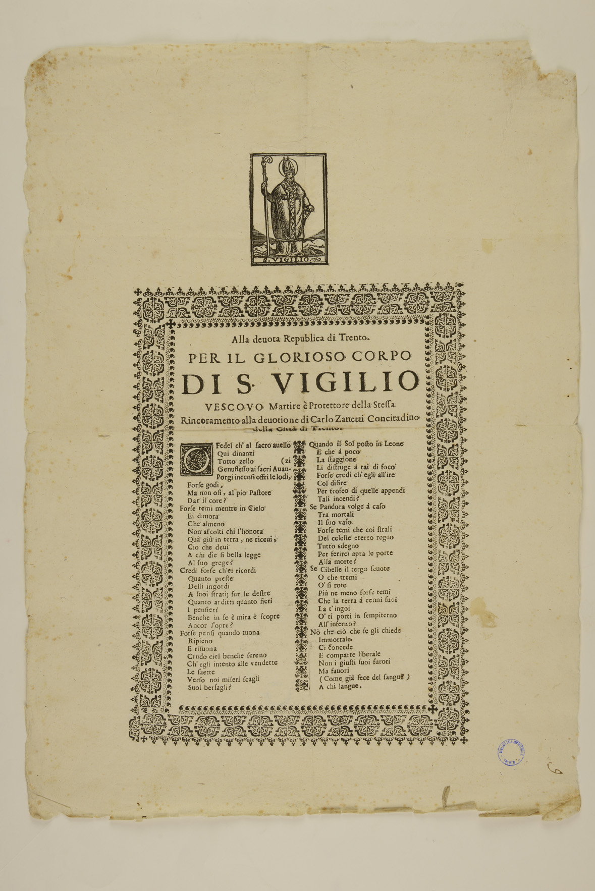 | Alla devota republica di Trento. Per il glorioso corpo di S. Vigilio vescovo martire e protettore della stessa rincoramento alla devotione di Carlo Zanetti concitadino della città di Trento |