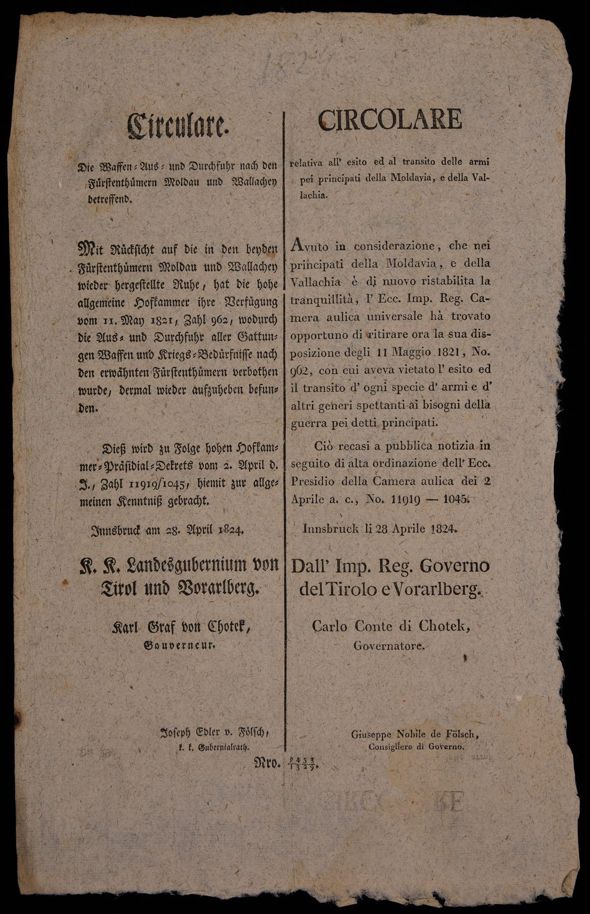 Proclama del Governo del Tirolo e Vorarlberg sulla circolazione delle armi in Moldavia e Valacchia, emanato il 28 aprile 1824, sottoscritto da Karl Chotek e Joseph Fölsch