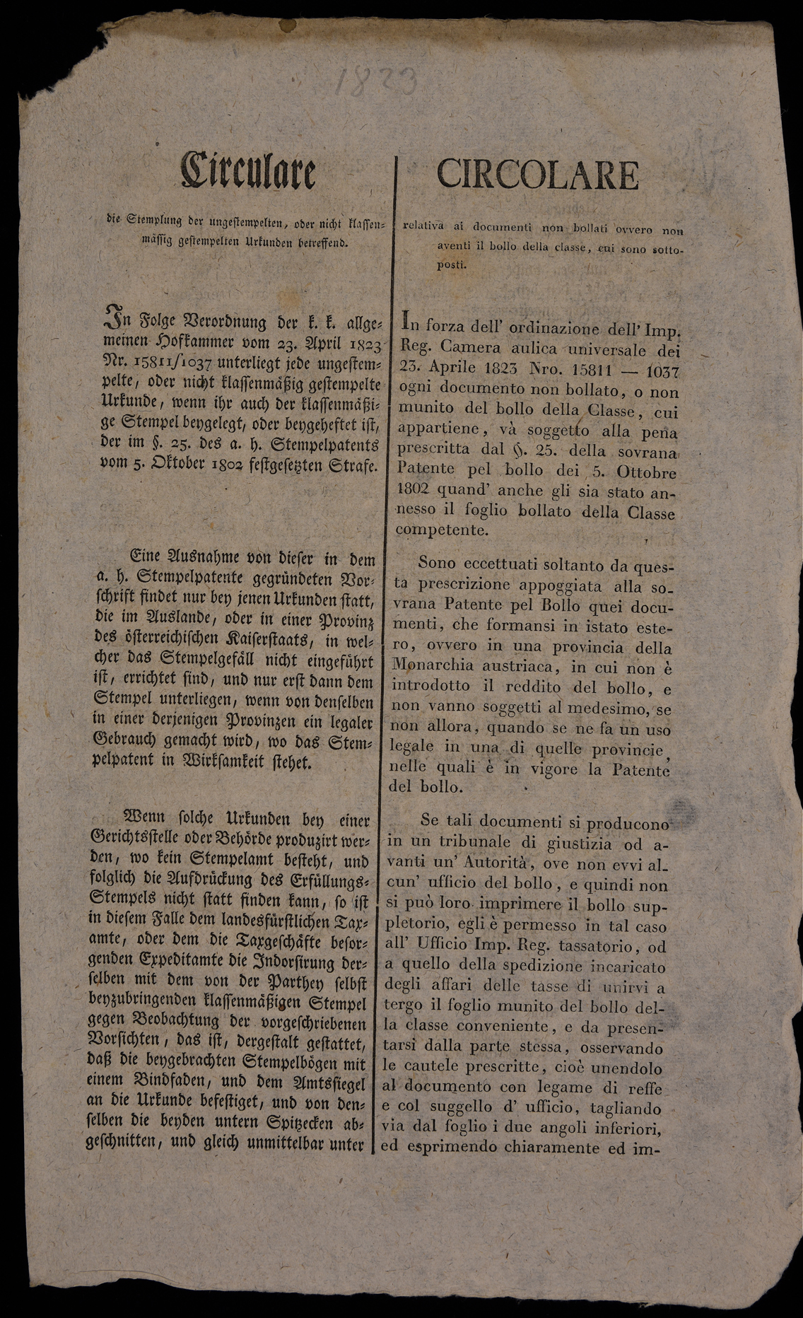 Proclama del Governo del Tirolo e Vorarlberg sull'obbligo del bollo per i documenti ad esso sottoposti, emanato il 20 maggio 1823, sottoscritto da Robert Benz e Luigi Ceschi