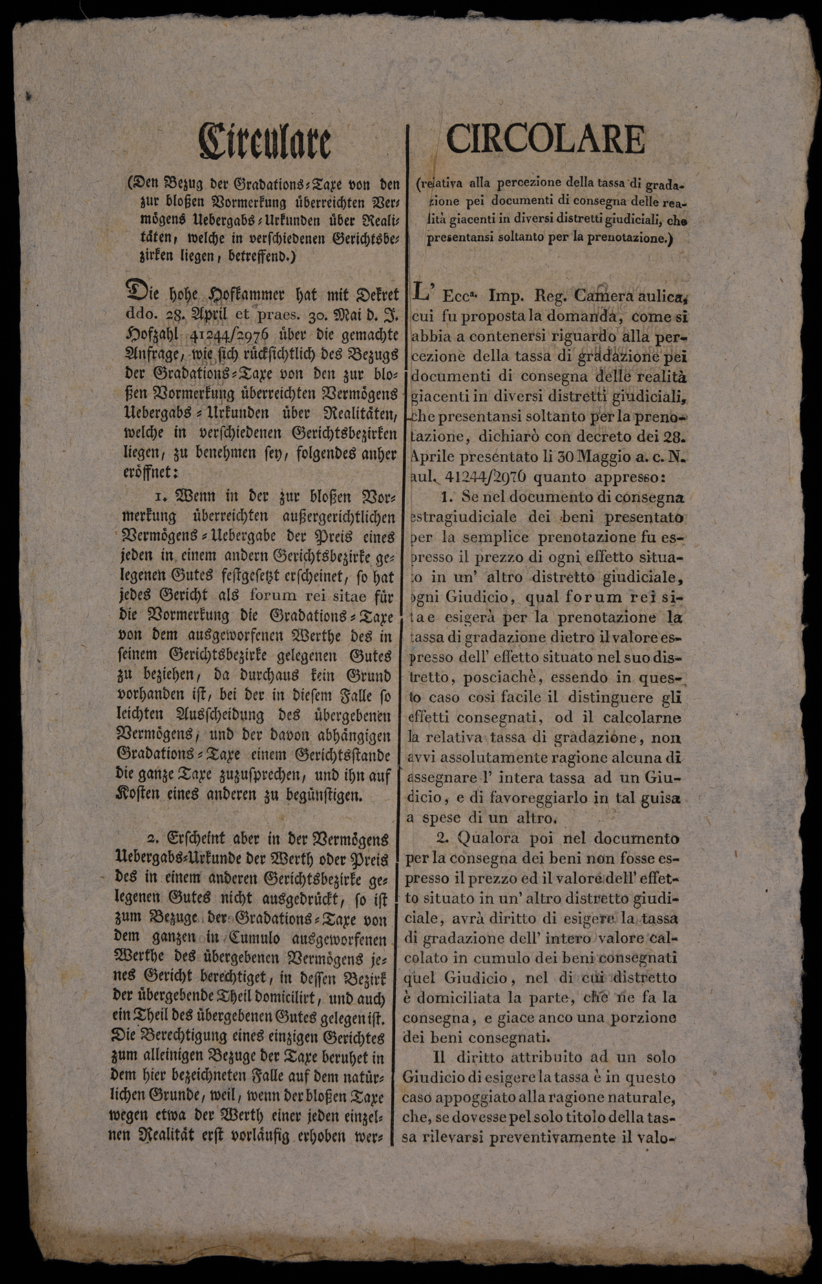 | Circulare (den Bezug der Gradations-Taxe von den zur blossen Vormerkung überreichten Vermögens Uebergabs-Urkunden über Realitäten, welche in verschiedenen Gerichtsbezirken liegen, betreffend) |
