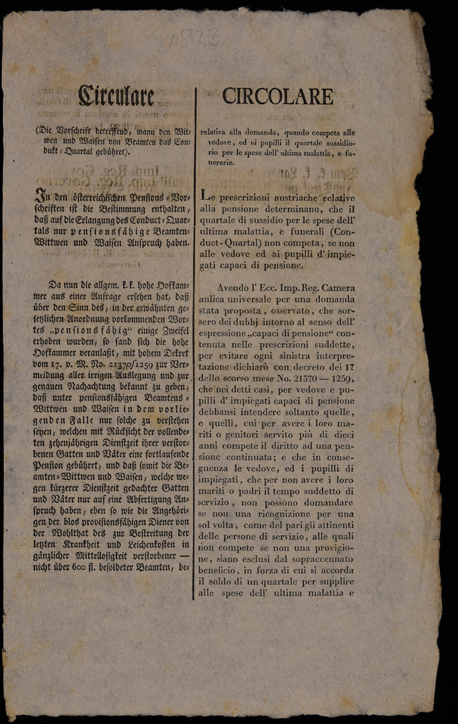 Proclama del Governo del Tirolo e Vorarlberg sulle modalità di concessione dei sussidi alle vedove, emanato il 22 luglio 1823, sottoscritto da Robert Benz e Luigi Ceschi