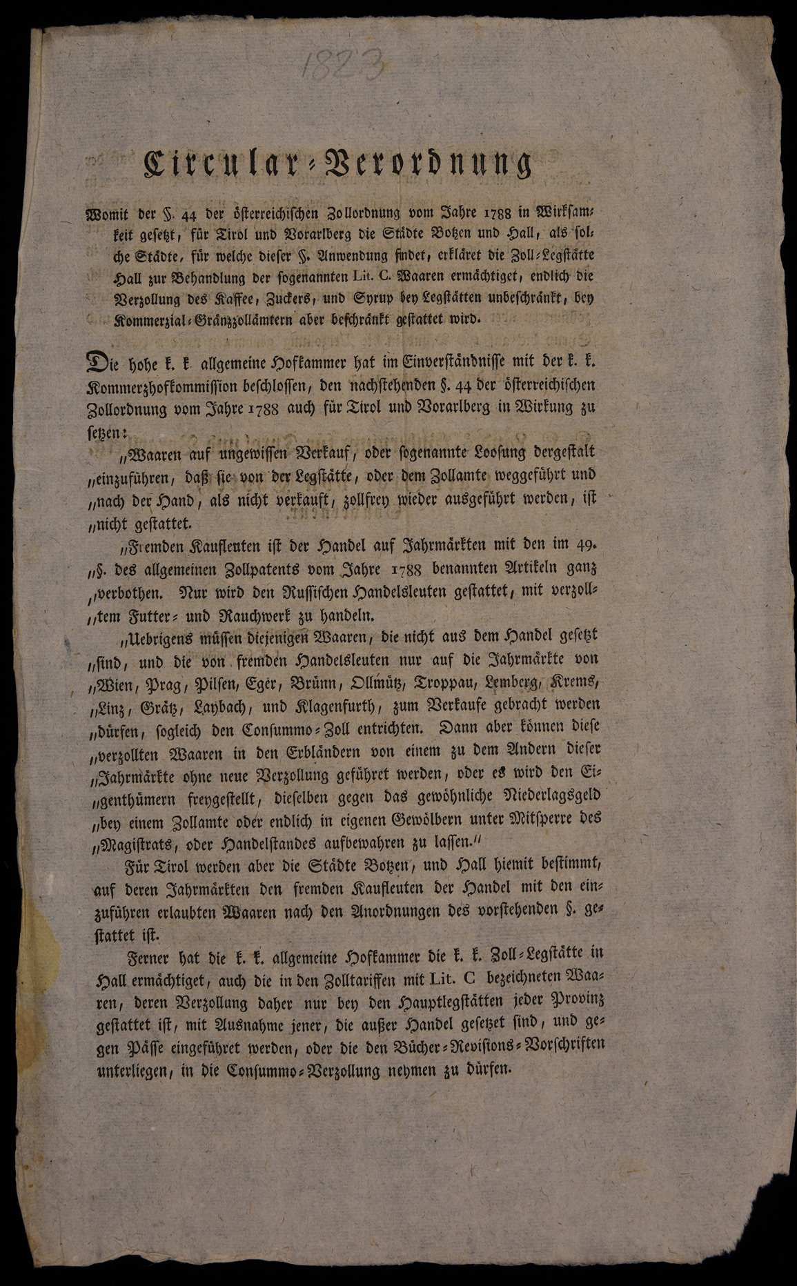 | Circular-Verordnung womit der § 44 der österreichischen Zollordnung vom Jahre 1788 in Wirksamkeit gesetzt, für Tirol und Vorarlberg die Städte Botzen und Hall, als solche Städte, für welche dieser § Anwendung findet, erkläret die Zoll-Legstätte Hall zur Behandlung der sogenannten Lit. C. Waaren ermächtiget ... |