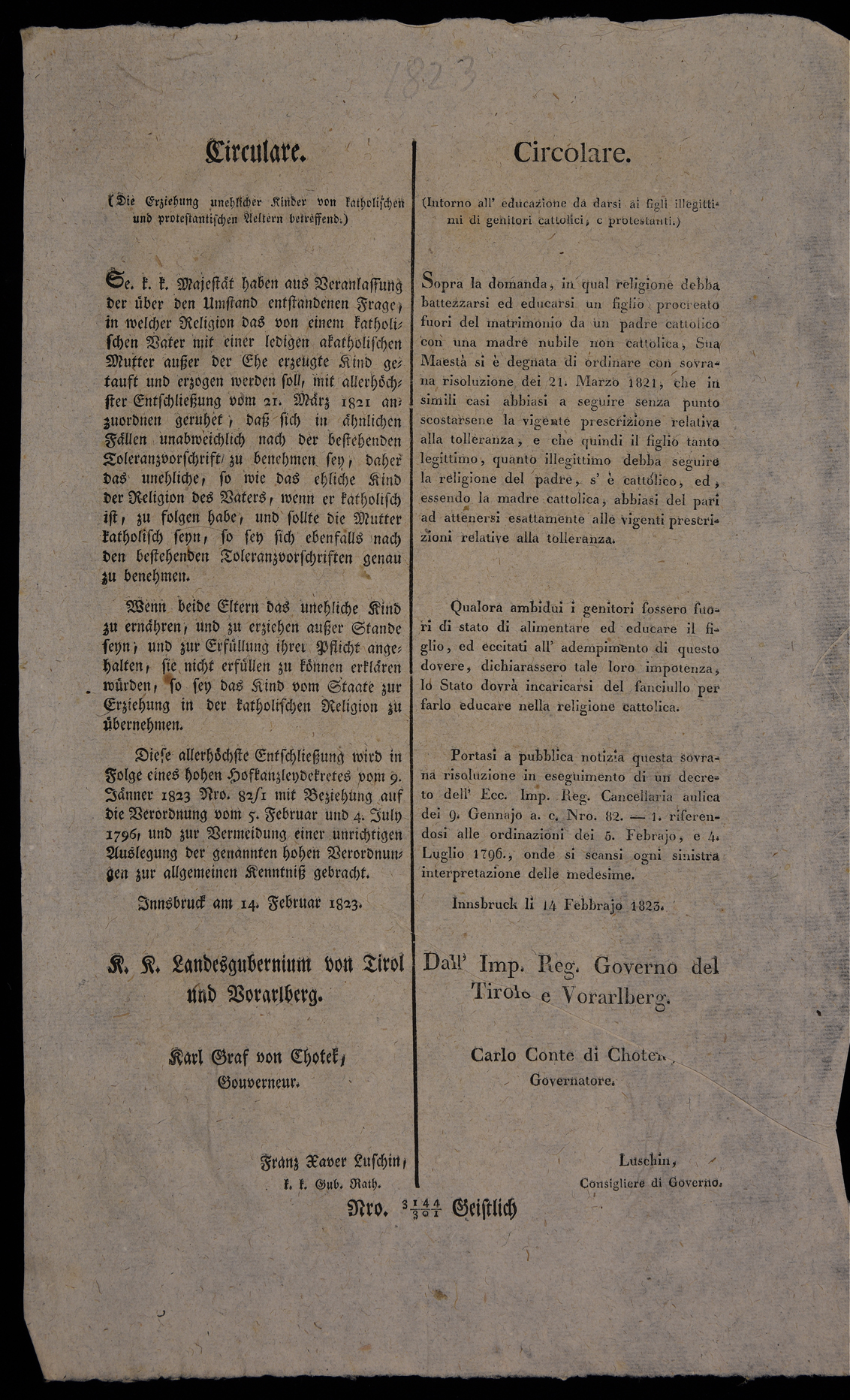 Proclama del Governo del Tirolo e Vorarlberg sull'educazione religiosa dei figli illegittimi, emanato il 14 febbraio 1823, sottoscritto da Karl Chotek e Franz Xaver Luschin