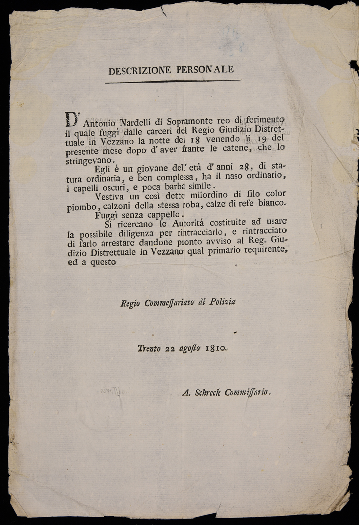 Proclama del Regio Commissariato di Polizia di Trento sui tratti personali di Antonio Nardelli, evaso, emanato il 22 agosto 1810, sottoscritto da Ambrosius Schreck.