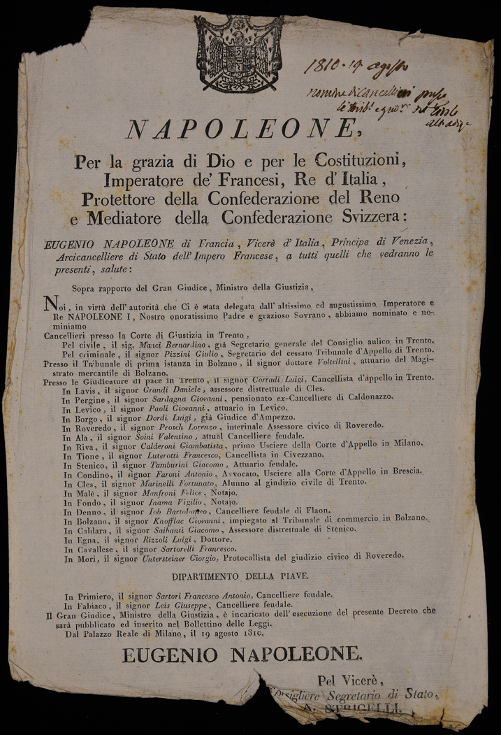 Proclama del vicerè d'Italia Eugenio Napoleone sulla nomina dei cancellieri presso la Corte di giustizia di Trento, il Tribunale di prima istanza di Bolzano, le Giudicature di pace a Trento e nel Dipartimento della Piave, emanato il 19 agosto 1810, sottoscritto da Antonio Strigelli.