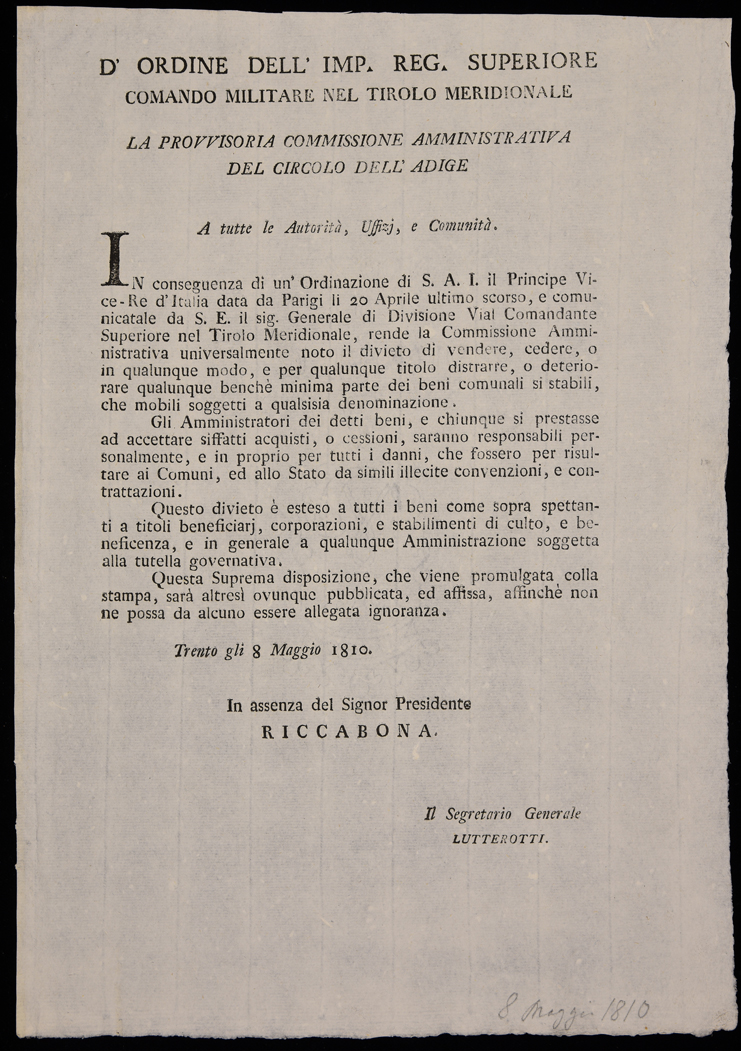 Proclama della provvisoria Commissione amministrativa del Circolo all'Adige sul divieto di alienazione dei beni pubblici, emanato il 8 maggio 1810, sottoscritto da Francesco Riccabona e Lutterotti (segretario generale).