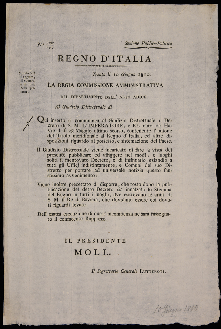 Proclama della Regia Commissione amministrativa del Dipartimento dell'Alto Adige sull'annessione del Tirolo meridionale al Regno d'Italia, emanato il 10 giugno 1810, sottoscritto da Sigismondo Moll e Lutterotti (segretario generale).