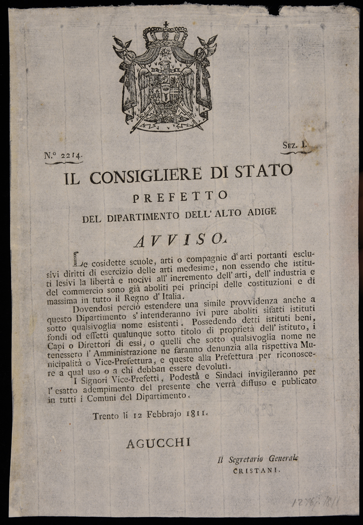 Proclama di Alessandro Agucchi sulle corporazioni d'arti e mestieri, emanato il 12 febbraio 1811, sottoscritto da Alessandro Agucchi e Carlo Cristiani (segretario generale).