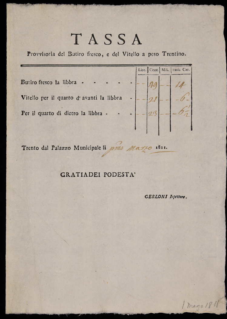 Tassa provvisoria del butiro fresco, e del vitello a peso trentino