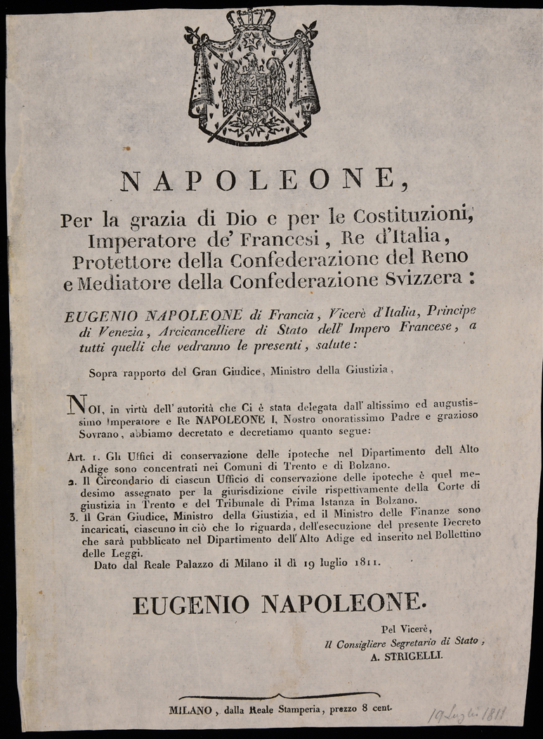 Proclama del vicerè d'Italia Eugenio Napoleone sugli uffici di conservazione delle ipoteche, emanato il 19 luglio 1811, sottoscritto da Eugenio Napoleone e Antonio Strigelli (Consigliere Segretario di Stato).