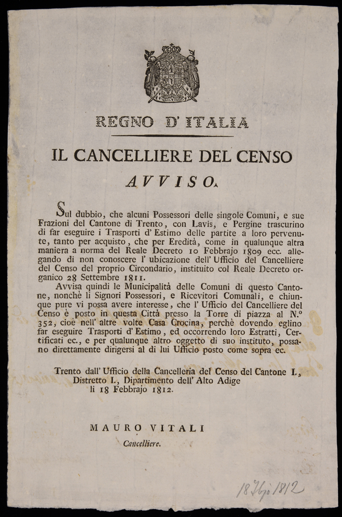 Al verso note manoscritte riportanti l'avvenuta pubblicazione a Trento il 22 febbraio 1812 ad opera di Voltolini, e sottoscrizioni manoscritte di Franz Setzer, Pietro F., Vigilio Cloch, Luigi S., Antonio Frappati, numero di inventario 588588.