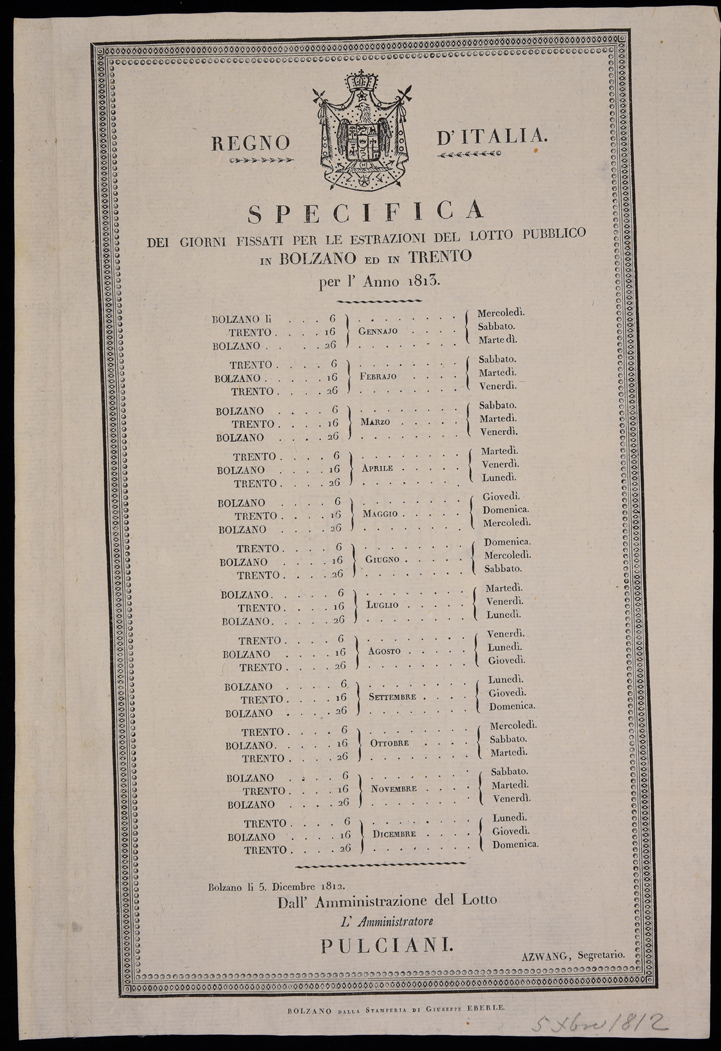 | Specifica dei giorni fissati per le estrazioni del lotto pubblico in Bolzano ed in Trento per l'anno 1813 |