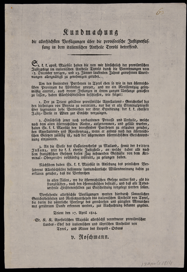| Kundmachung die allerhöchsten Verfügungen über die provisorische Justizverfassung in dem italienischen Antheile Tyrols betreffend |