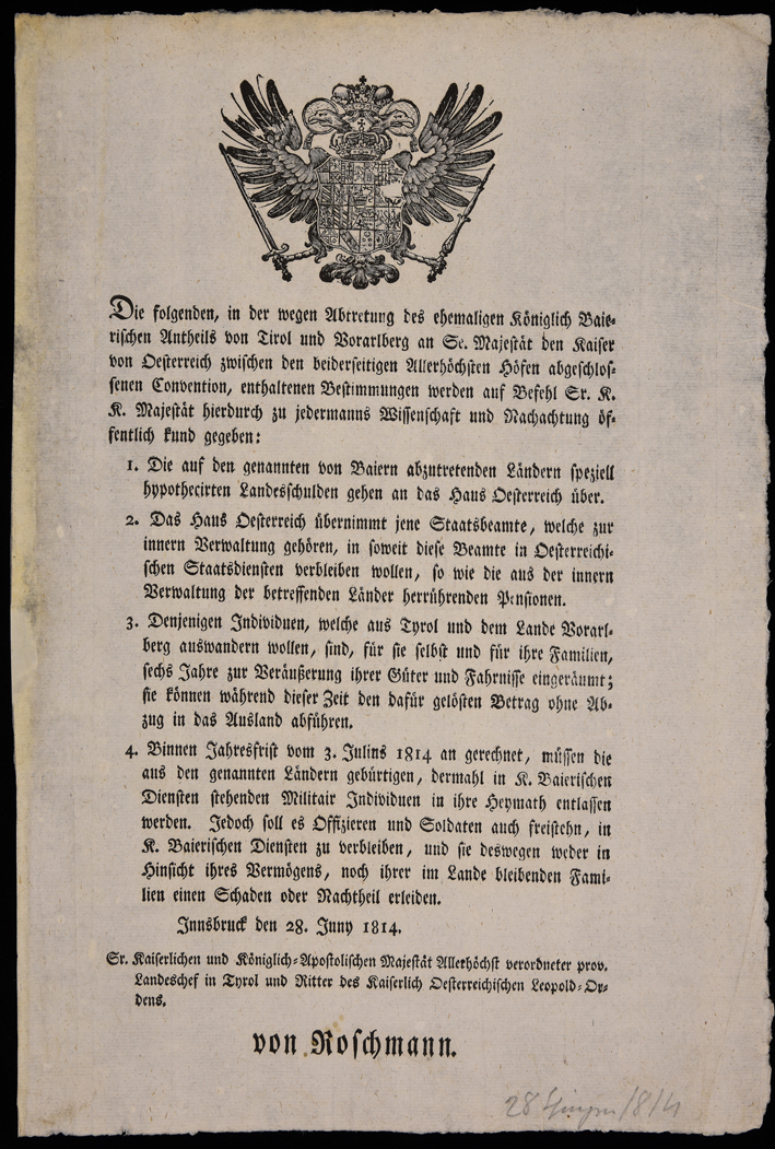 | Die folgenden, in der wegen Abtretung des ehemaligen königlich baierischen Antheils von Tirol und Vorarlberg an Se. Majestät den Kaiser von Oesterreich ... |