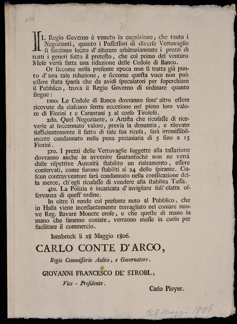 Proclama di Carlo Maria Roberto d'Arco sul divieto di accrescere il prezzo dei viveri col pretesto della prossima riduzione del valore nominale delle cedole da banco, emanato il 28 maggio 1806, sottoscritto da Carlo Maria Roberto d'Arco (commissario e governatore), Giovanni Francesco Strobl (vice-presidente), Karl Ployer.