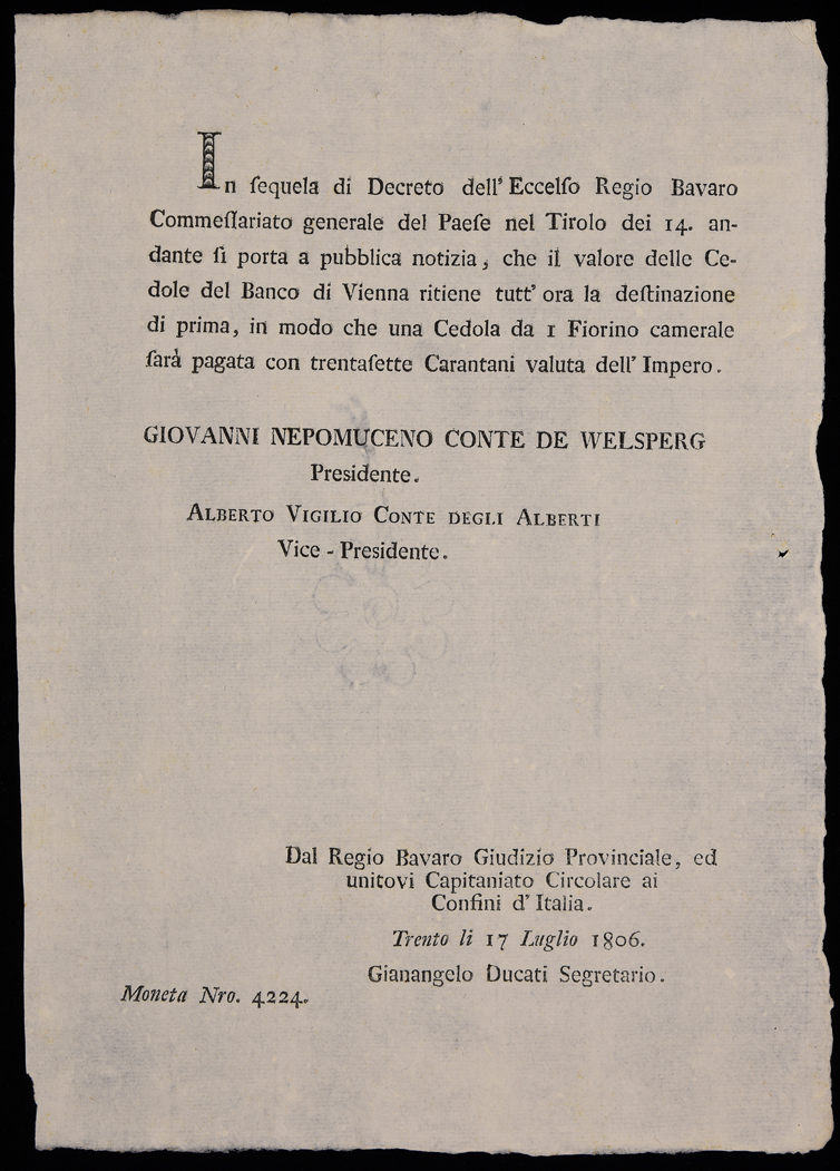 Proclama del Regio Bavaro Giudizio provinciale ed unitovi Capitaniato circolare ai confini d'Italia sul valore delle cedole da banco, emanato il 17 luglio 1806, sottoscritto da Giovanni Nepomuceno Welsperg (presidente), Alberto Vigilio Alberti (vice-presidente), Gianangelo Ducati (segretario)