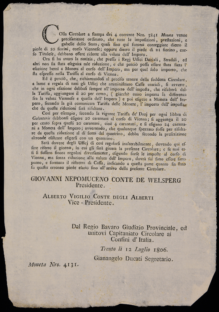 Proclama del Regio Bavaro Giudizio provinciale ed unitovi Capitaniato circolare ai confini d'Italia sull'esazione delle imposte in base alla valuta dell'impero, emanato il 12 luglio 1806, sottoscritto da Giovanni Nepomuceno Welsperg (presidente), Alberto Vigilio Alberti (vice-presidente), Gianangelo Ducati (segretario)