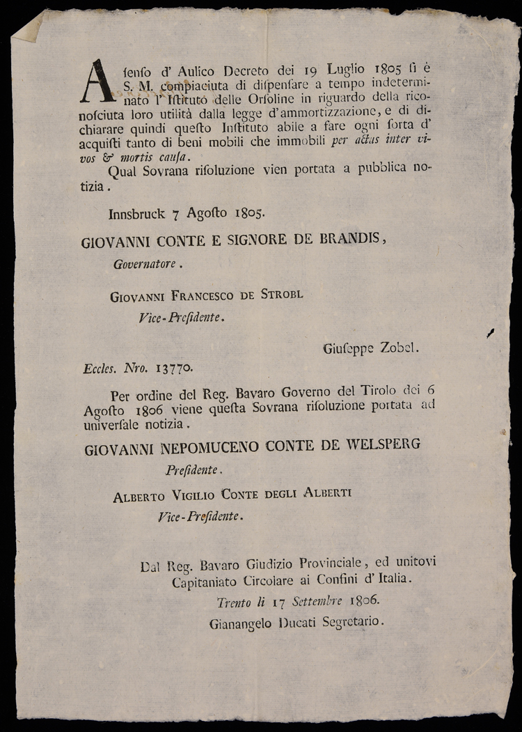 Proclama di Johann von Brandis sulle Orsoline seguito dalla notificazione del Regio Bavaro Giudizio provinciale ed unitovi Capitaniato circolare ai Confini d'Italia, con ristampa del proclama emesso ad Innsbruck il 7 agosto 1805 da Johann von Brandis e sottoscritto da Giovanni Francesco Strobl e Giuseppe Zobel, emanato il 17 settembre 1806, sottoscritto da Giovanni Nepomuceno Welsperg (presidente), Alberto Vigilio Alberti (vice-presidente), Gianangelo Ducati (segretario)