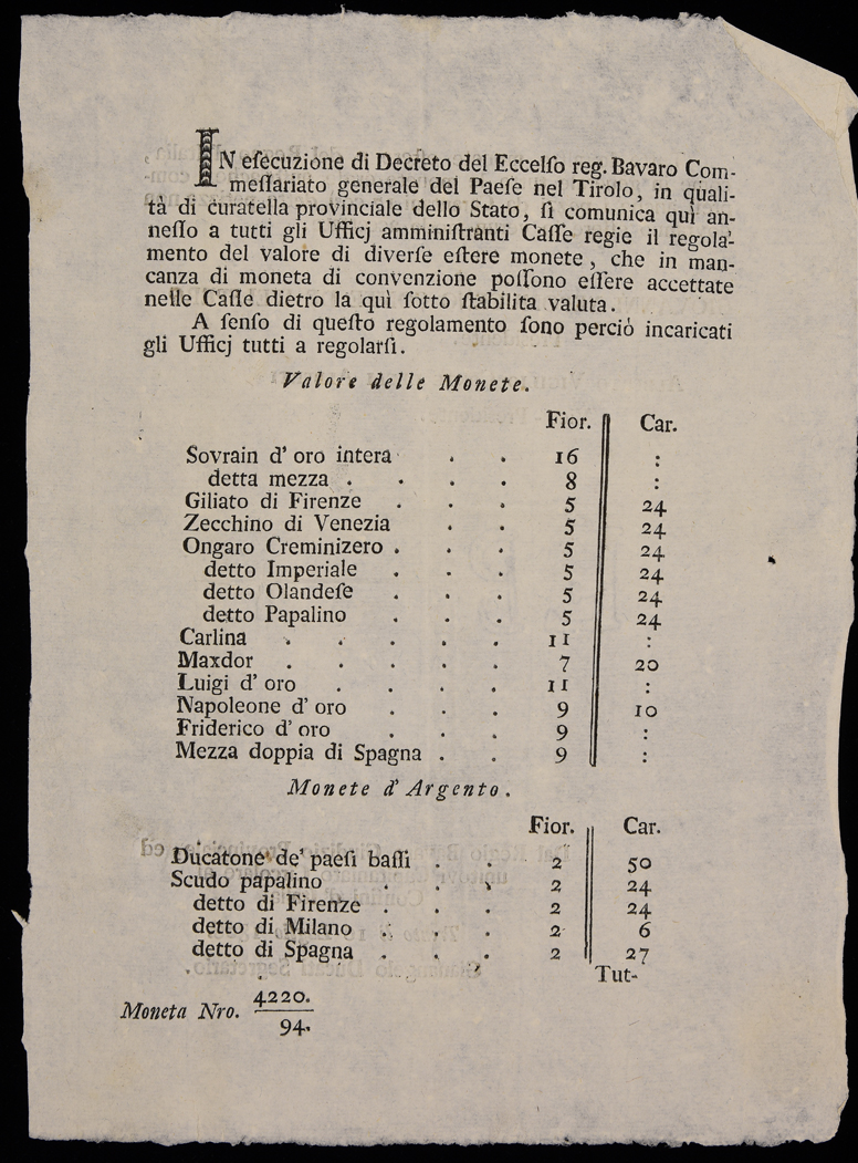 Proclama del Regio Bavaro Giudizio provinciale ed unitovi Capitaniato circolare ai confini d'Italia sul valore delle monete estere, emanato il 16 luglio 1806, sottoscritto da Giovanni Nepomuceno Welsperg (presidente), Alberto Vigilio Alberti (vice-presidente), Gianangelo Ducati (segretario)