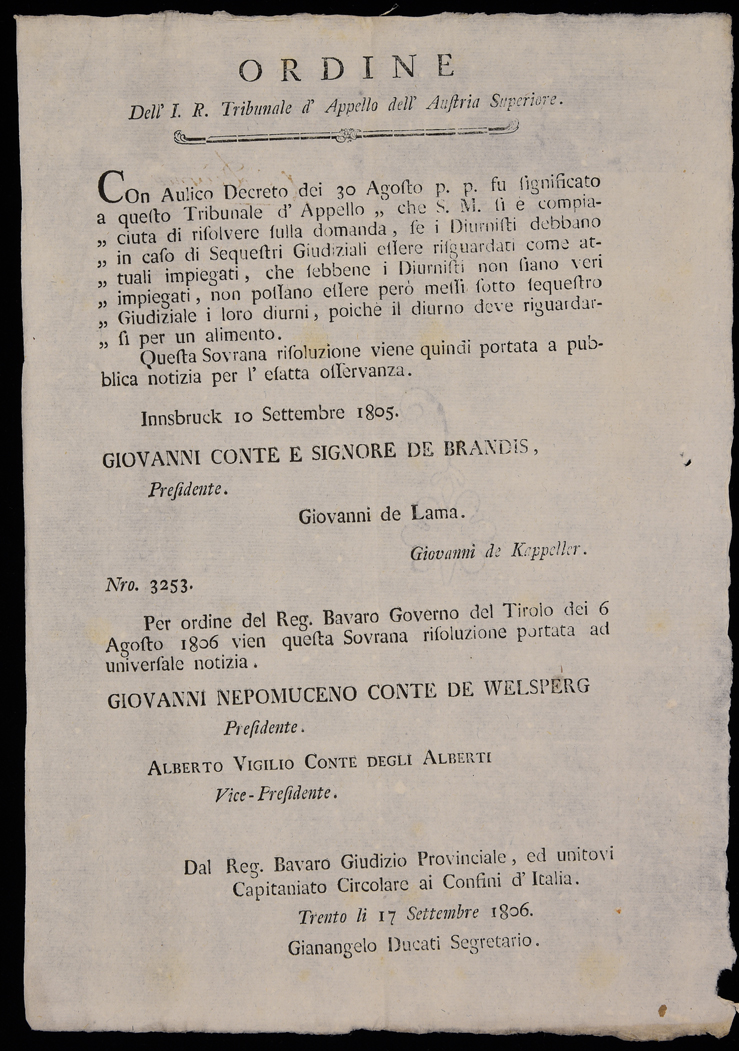 Ristampa del proclama emesso ad Innsbruck il 10 settembre 1805 dall'Imperial Regio Tribunale dell'Austria Superiore, seguito dall'ordine di pubblicazione del Regio Bavaro Giudizio provinciale ed unitovi Capitaniato circolare ai confini d'Italia, emanato il 17 settembre 1806, sottoscritto da Giovanni Nepomuceno Welsperg (presidente), Alberto Vigilio Alberti (vice-presidente), Gianangelo Ducati (segretario)