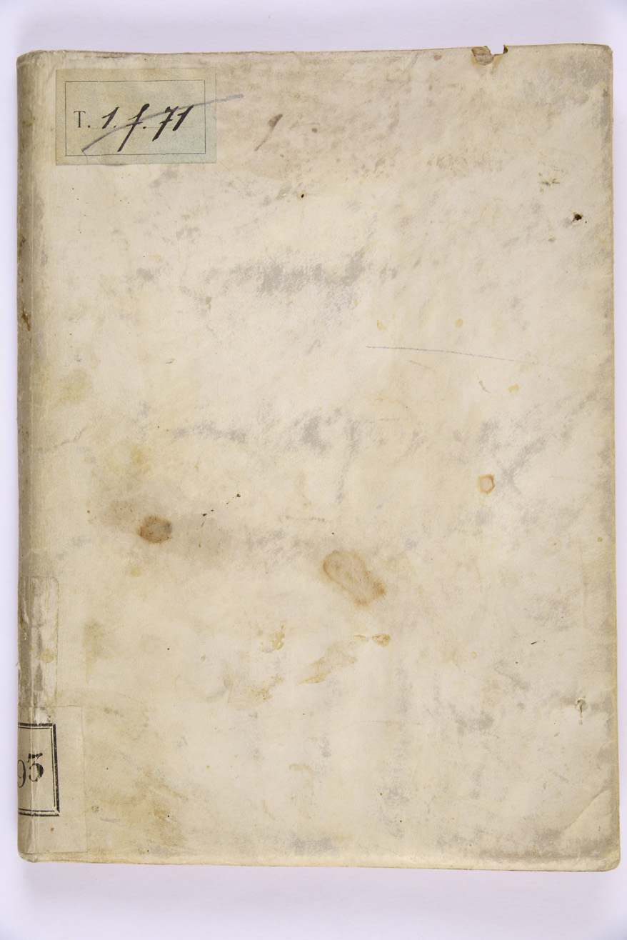 Legato in pergamena semirigida, tagli colorati di rosso, talloncino cartaceo al dorso con antica segnatura di collocazione, tracce di 4 lacci, c. di guardia ant., mm. 205x150x10, ex libris di Antonio Gaudenzio Gaudenti e della Biblioteca al verso del piatto anteriore, timbro della Biblioteca al frontespizio e a c. χ1v, numero d'inventario X/560 a c. K3v. Correzioni manoscritte alle cc. F2v-F3r, pecette cartacee con correzioni a stampa incollate alle cc. D4v e F2v (questi interventi si trovano anche nell'altro esemplare della Comunale, che però presenta le cc. χ1, 2 tra K3 e K4). Provenienza: Collezione Mazzetti, antiche segnature di collocazione: 2993 (Mazzetti, al dorso), T 1 f 71 (Comunale).