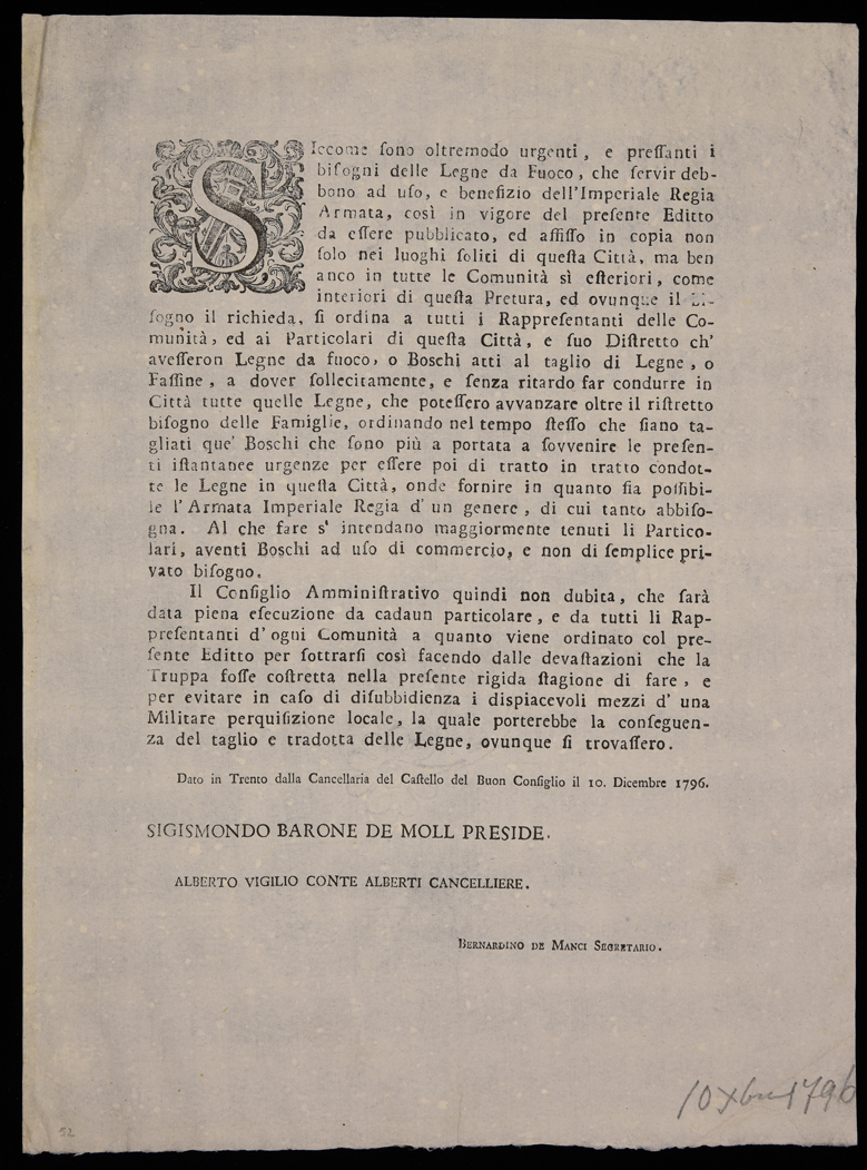 Proclama del Consiglio amministrativo di Trento che ordina di portare in città legna per i bisogni dell'Imperial Regia Armata, emanato il 10 dicembre 1796, sottoscritto da Sigismondo Moll (preside), Alberto Vigilio Alberti (cancelliere), Bernardino Manci (segretario).