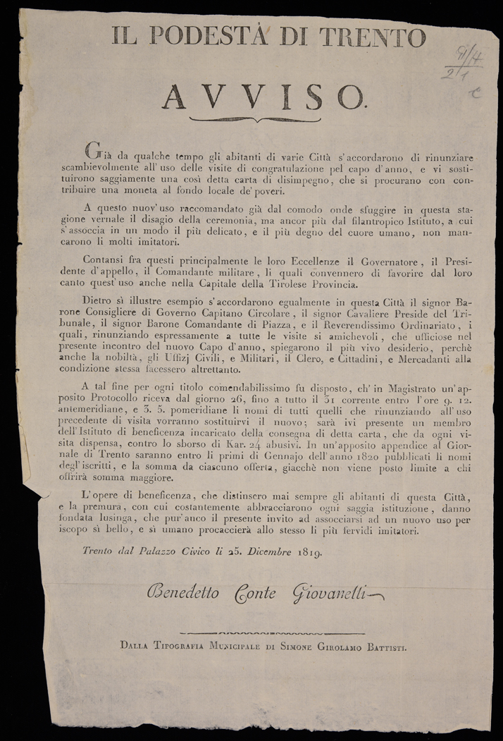 Avviso del podestà Benedetto Giovanelli che rende nota la possibilità di rinunciare alle visite del capodanno, sostituendovi una carta di disimpegno da procurarsi in cambio di un'offerta al fondo locale dei poveri, emanato il 25 dicembre 1819, sottoscritto da Benedetto Giovanelli (podestà).