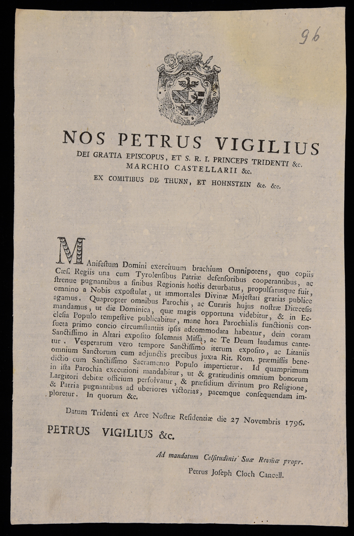 Avviso di Pietro Vigilio Thun che ordina preghiere e una messa di ringraziamento per i successi avuti in guerra, stabilendone i tempi e i modi, emanato il 27 novembre 1796, sottoscritto da Pietro Vigilio Thun e Pietro Giuseppe Cloch.