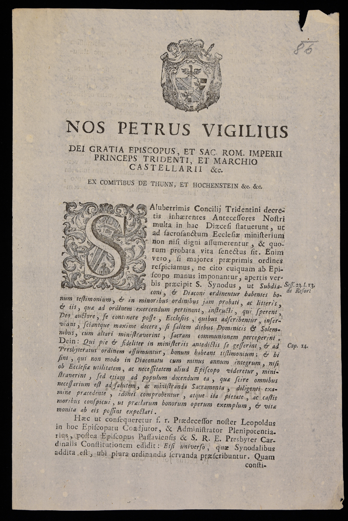 Proclama di Pietro Vigilio Thun sulla formazione sacerdotale, emanato il 25 gennaio 1786, sottoscritto da Pietro Vigilio Thun e Pietro Giuseppe Cloch, stemma di Pietro Vigilio Thun.