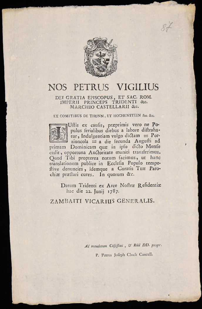 Proclama di Pietro Vigilio Thun, principe-vescovo di Trento, sull'indulgenza della Porziuncola, emanato il 22 giugno 1787, sottoscritto da Simone Albano Zambaiti (vicario generale) e Pietro Giuseppe Cloch (cancelliere), stemma di Pietro Vigilio Thun.