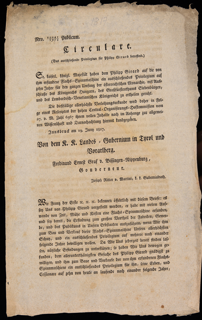 | Circulare (das ausschliessende Privilegium für Philipp Girard betreffend) |