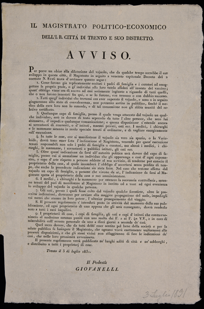 | Il Magistrato politico-economico dell'I.R. città di Trento e suo distretto. Avviso |