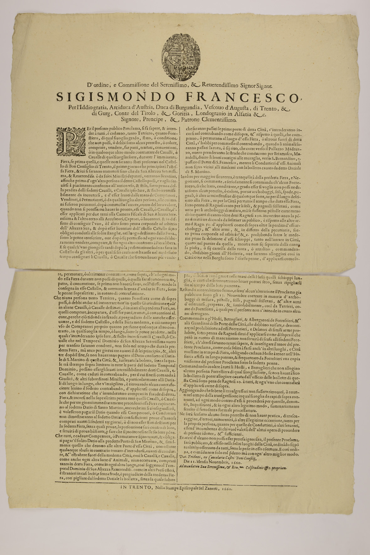 Proclama sulle fiere emanato l'11 novembre 1660 da Sigismondo Francesco d’Asburgo