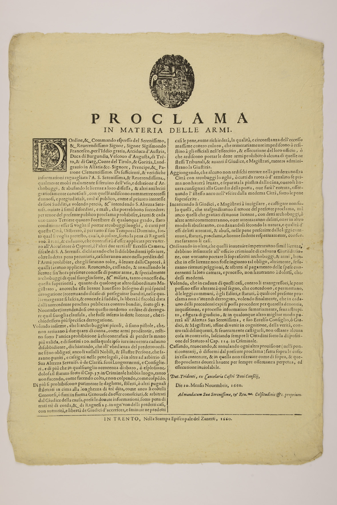 Proclama sulle armi emanato il 10 novembre 1660 da Sigismondo Francesco d'Asburgo