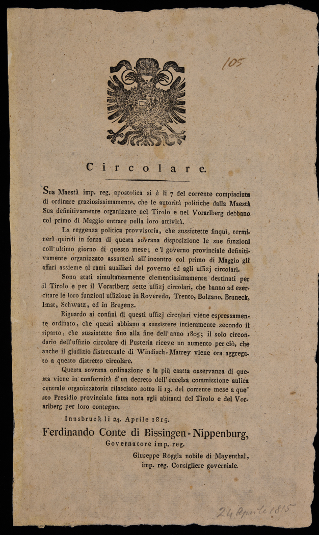 Sua Maestà imp. reg. apostolica si è li 7 del corrente compiaciuta di ordinare graziosissimamente, che le autorità politiche dalla Maestà sua definitivamente organizzate nel Tirolo e nel Vorarlberg ...