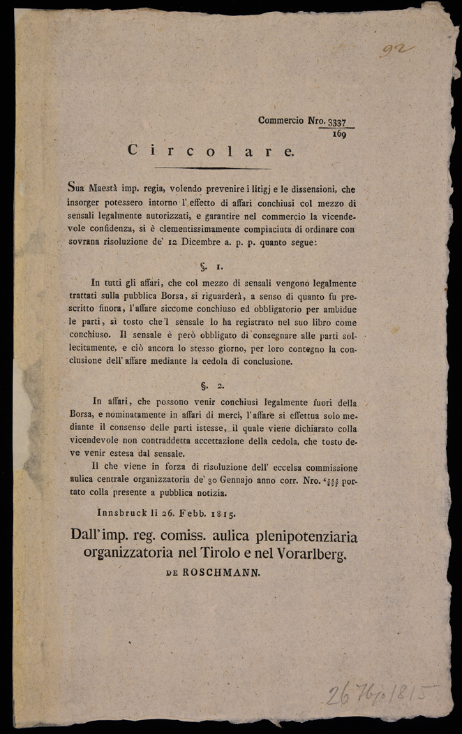 Sua Maestà imp. regia volendo prevenire i litigi e le dissensioni che insorger potessero intorno l'effetto di affari conchiusi col mezzo di sensali ...