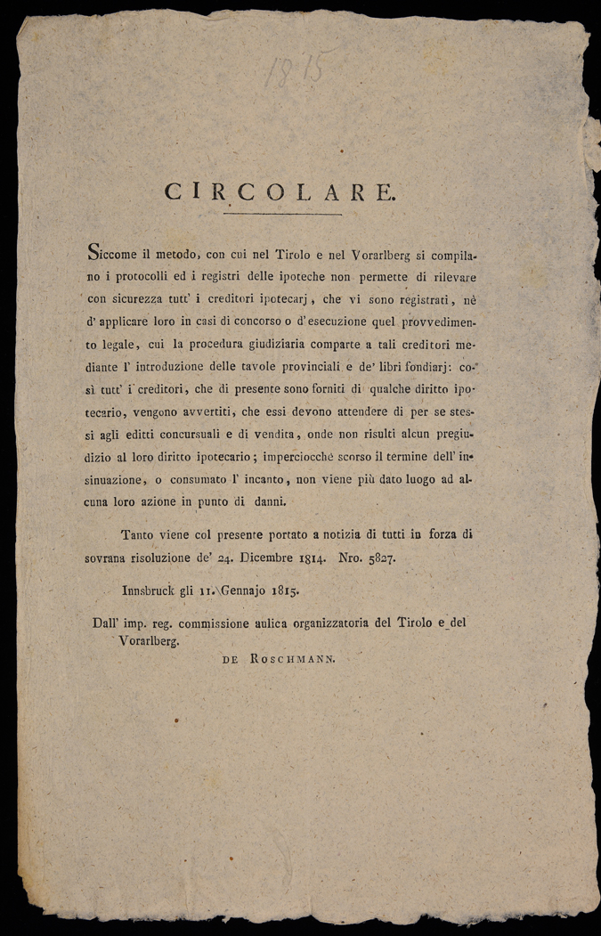 Siccome il metodo, con cui nel Tirolo e nel Vorarlberg si compilano i protocolli ed i registri delle ipoteche non permette di rilevare con sicurezza tutt'i creditori ipotecari ...