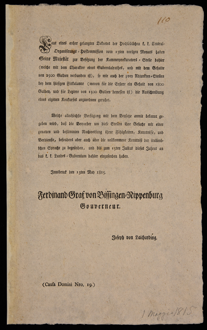 | Laut eines anher gelangten Dekretes der Hochlöblichen k.k. Central-Organisirungs-Hofkommission vom 13ten vorigen Monats ... |