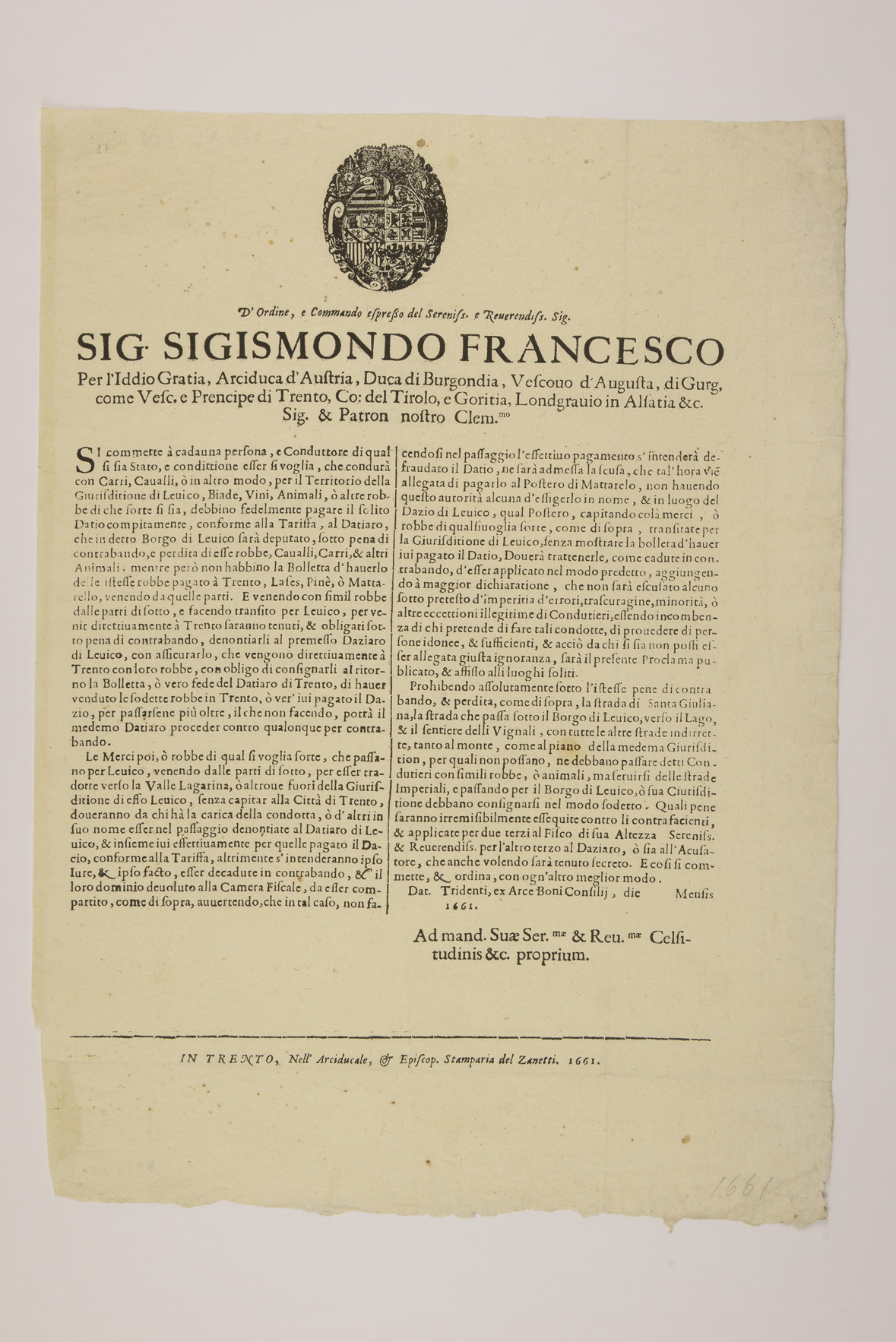 | D'ordine e commando espresso del sereniss. e reverendiss. sig. sig. Sigismondo Francesco per l'Iddio gratia, arciduca d'Austria, duca di Burgondia, vescovo d'Augusta, di Gurg, come vesc. e prencipe di Trento, conte del Tirolo e Goritia, Londgravio in Alsatia &c. sig. & patron nostro clem.mo |