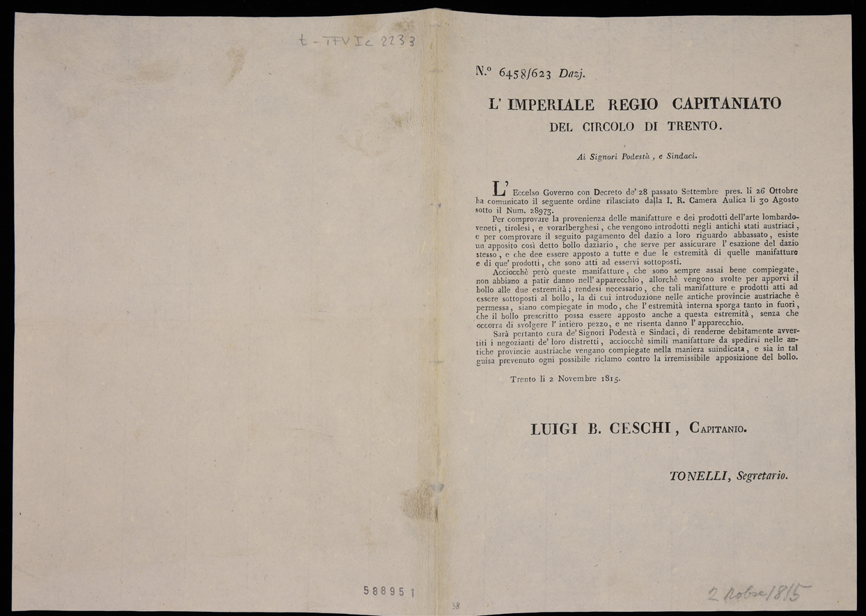 L'Imperiale Regio Capitaniato del circolo di Trento ai signori podestà e...