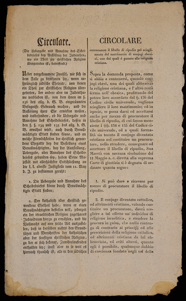 | Circolare concernente il libello di ripudio pel scioglimento del matrimonio di coniugi ebraici, uno dei quali è passato alla religione cristiana |