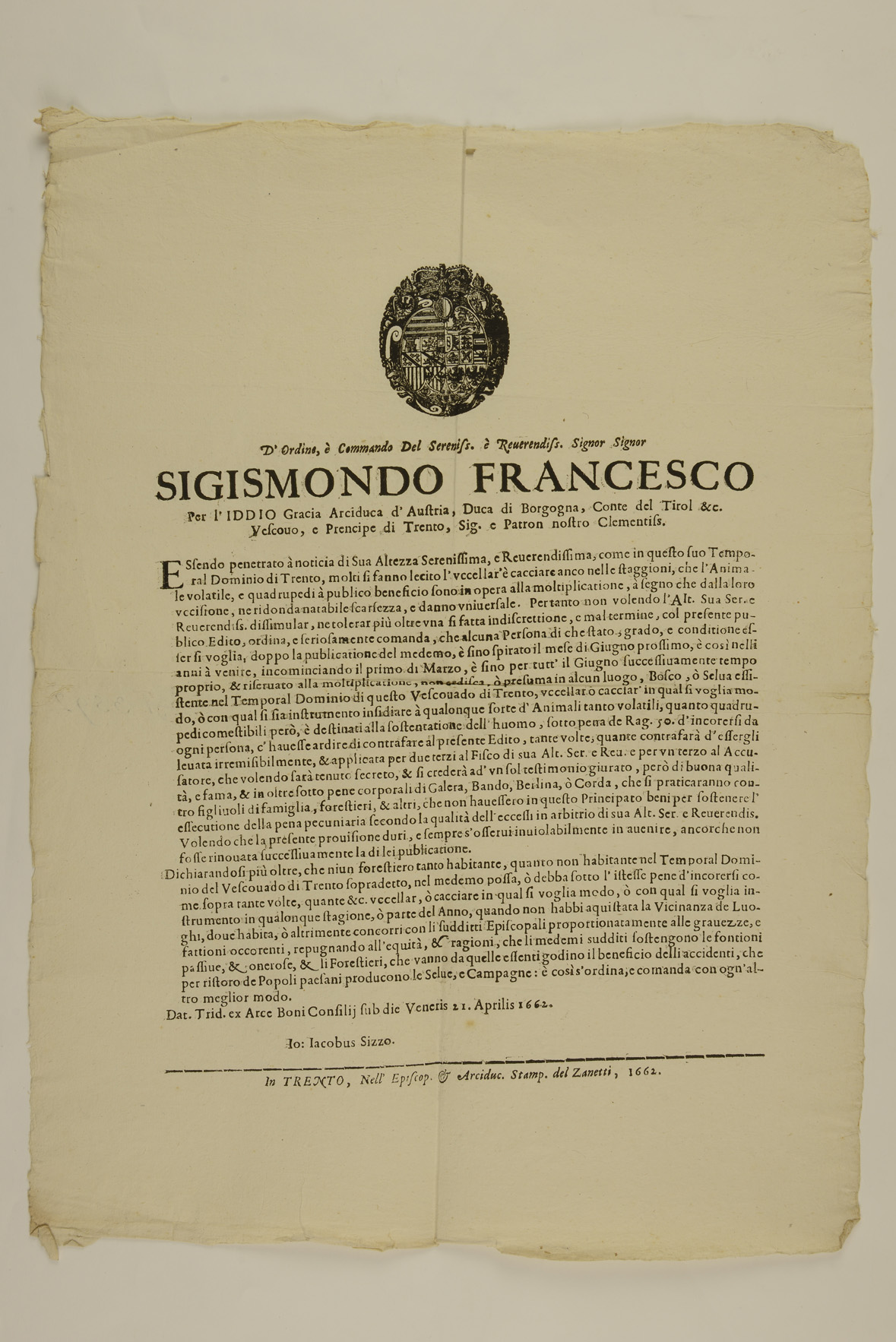 Proclama su caccia e uccellagione emanato il 21 aprile 1662 da Sigismondo Francesco d’Asburgo