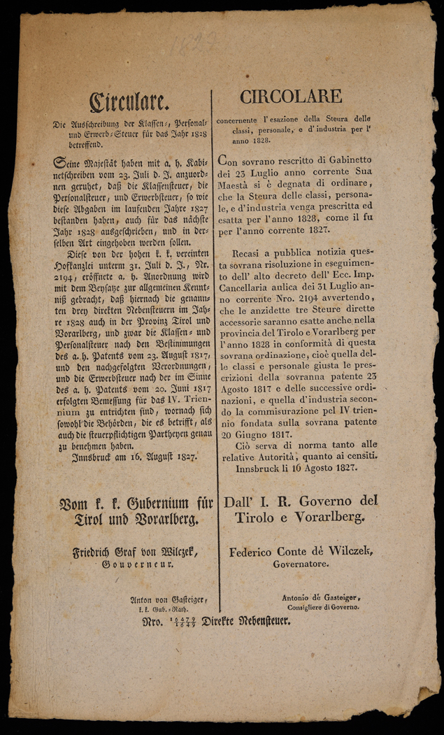 | Circulare die Ausschreibung der Klassen-, Personal-und Erwerb-Steuer für das Jahr 1828 betreffend |