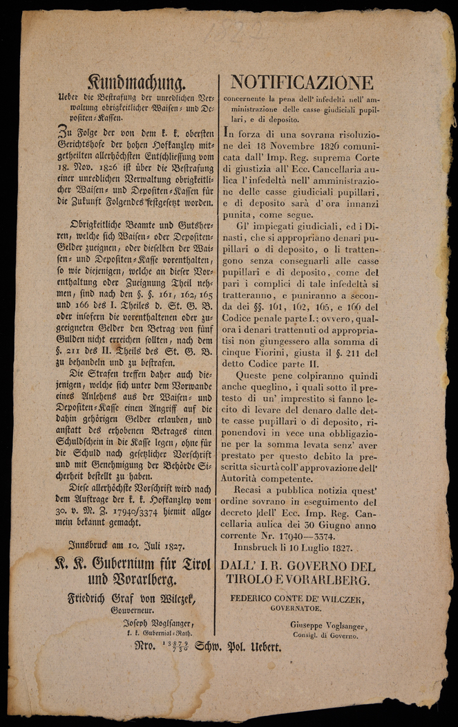 | Kundmachung, ueber die Bestrafung der unredlichen Verwaltung obrigkeitlicher Waisen-und Depositen-Kassen |