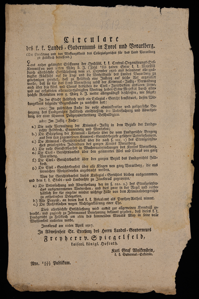 | Circulare des k.k. Landes-Guberniums in Tyrol und Vorarlberg (die Errichtung und den Wirkungskreis des Collegialgerichts für das Land Vorarlberg zu Feldkirch betreffend) |