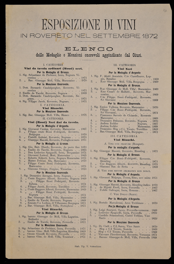 | Esposizione di vini in Rovereto nel settembre 1872. Elenco delle medaglie e menzioni onorevoli aggiudicate dal giurì |