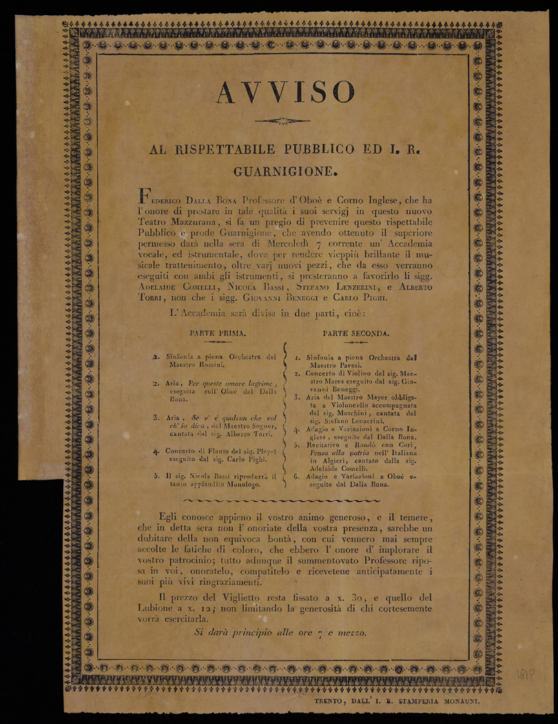 Federico Dalla Bona professore d'oboe e corno inglese, cha ha l'onore di prestare in tale qualità i suoi servigj in questo nuovo teatro Mazzurana ...